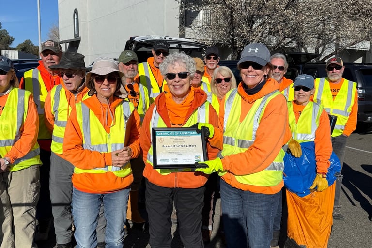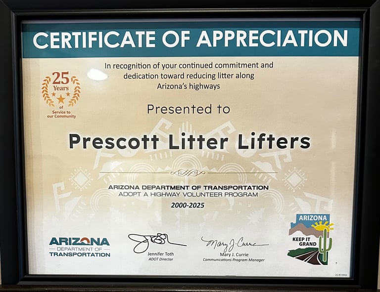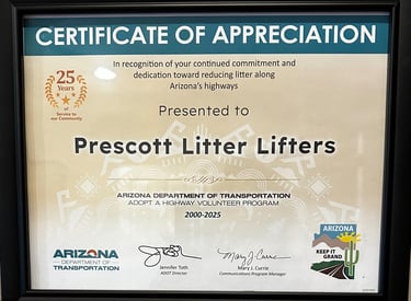 We are dedicated volunteers picking up litter along 52 - 68 miles of road in the Prescott area since 1981. We endeavor to beautify the Prescott area, reduce the environmental impact of trash and foster community spirit.