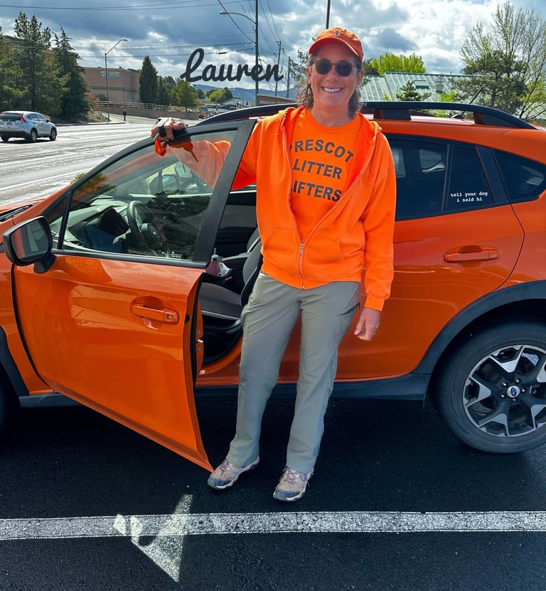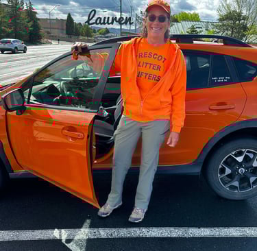 Since 1981, we have volunteered to pick up litter in the Prescott area. We have 52 miles of roadways officially adopted, but with the extra miles we pick up doing our adopted areas, it's 68 miles total. In 2024, we picked up 2,071 bags full of trash. After pickup, we often enjoy coffee together.